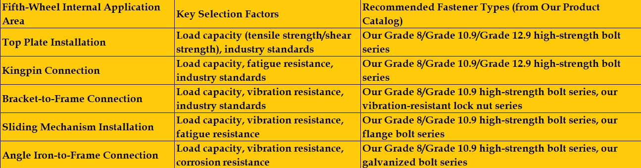 El sistema de la quinta rueda juega un papel crucial en la conexión del tractor y el remolque, que es esencial para el transporte seguro y eficiente. Seleccionar correctamente los sujetadores apropiados es vital para la integridad y la vida útil de esta conexión, afectando directamente la seguridad y la confiabilidad operativa. Este boletín tiene como objetivo guiar a los clientes, según el catálogo de productos de nuestra empresa, a través de los factores clave a considerar al seleccionar sujetadores para aplicaciones de la quinta rueda.